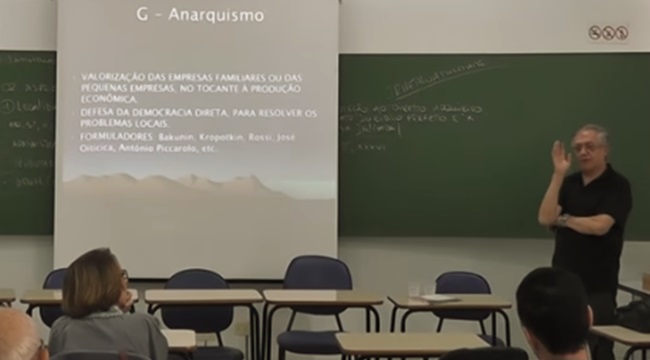 Na aula, Vélez resume o “gramscismo” como “a defesa da propriedade coletiva dos meios de produção mediante a transferência dos proprietários burgueses para os sindicatos de trabalhadores, além da defesa da escola única, controlada pelos sindicatos de trabalhadores e a defesa da internacionalização da hegemonia do proletariado“.