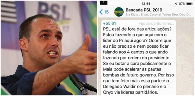 Eduardo Bolsonaro acaba revelando o que não devia em discussão de grupo interno do PSL no WhatsApp. Em público, Jair Bolsonaro afirma que não pretende se meter na disputa pelas presidências da Câmara e Senado. O filho desmentiu o pai e ainda tratou de outros assuntos espinhosos