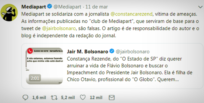 Mediapart se solidariza com a jornalista @constancarezend, vítima de ameaças. As informações publicadas no “club de Mediapart”, que serviram de base para o tweet de @jairbolsonaro, são falsas. O artigo é de responsabilidade do autor e o blog é independente da redação do jornal. https://t.co/0BIDr4TXSd