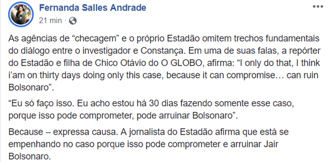 Bolsonaro compartilhou na noite desse domingo tuíte com acusação falsa feita pelo Terça Livre. A página divulgou que a repórter havia declarado a um jornalista do Mediapart que pretendia “arruinar” a vida do senador Flávio Bolsonaro (PSL-RJ) e buscar o impeachment do presidente. Constança é autora de várias reportagens que apontam as movimentações financeiras atípicas de Fabrício Queiroz, ex-assessor de Flávio na Assembleia Legislativa do Rio de Janeiro.