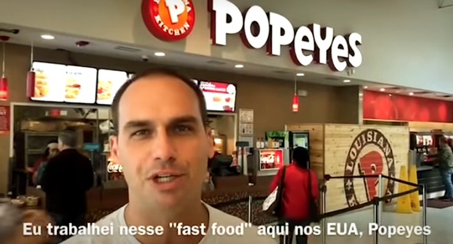 Pois bem, há alguns anos Eduardo postou um vídeo afirmando que em 2005, durante as férias da universidade, trabalhou na terra do Tio Sam em uma lanchonete da rede Popeyes.