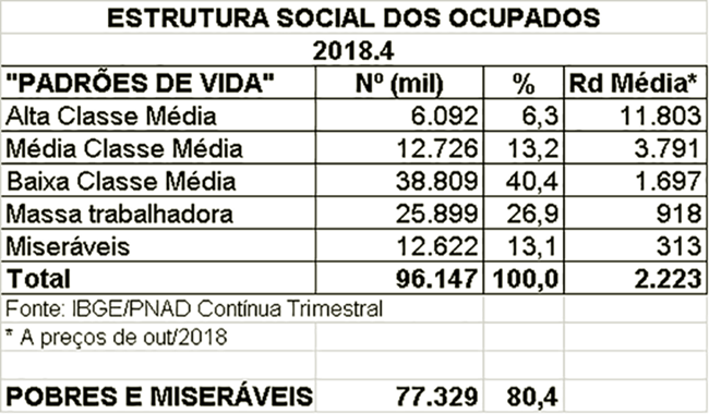 Segundo ele, “olhando os dados recentes, como o dado do último trimestre de 2018, percebe-se que 80% dos ocupados são classificados em alguma dessas categorias de pobres: 40% estão na camada ‘superior dos pobres’, 27% na camada dos ‘pobres’ e 13% na camada dos ‘miseráveis’”. Em termos de renda, informa, aqueles que estão na camada “superior dos pobres” têm uma renda média mensal de 1.700 reais, os “pobres” recebem 920 reais mensais e os “miseráveis”, 310 reais mensais.