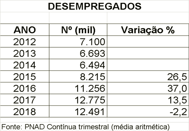 O que aconteceu de 2015 para cá? Primeiro, o impacto imediato da crise foi em relação ao desemprego: em 2015 houve um crescimento do desemprego de 26,5%. Esse desemprego imediato ocorreu após o ajuste do governo Dilma. Em 2016, que foi o ano mais grave da crise, o aumento da taxa de desemprego foi de 37%, em 2017 teve um crescimento de 13,5% e em 2018 houve uma redução de 2,2%. O grande fenômeno em termos de mercado de trabalho é o desemprego e este é o primeiro aspecto da crise.