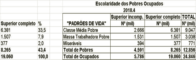 “É assustadora a bomba-relógio que temos pela frente. Considerando os dados do quarto trimestre de 2018 da Pnad Contínua, é possível observar que dos 5,8 milhões de ocupados com ensino superior incompleto, 4,6 milhões são ‘pobres’. Mais grave ainda: 8,3 milhões de ocupados que estão classificados na categoria ‘pobres’ têm ensino superior completo. Se juntarmos aqueles que têm ensino superior incompleto e aqueles que têm ensino superior completo, temos 12,9 milhões de trabalhadores ‘pobres’ com nível superior”, afirma.