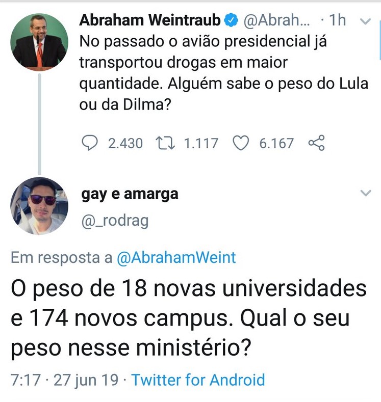“No passado o avião presidencial já transportou drogas em maior quantidade. Alguém sabe o peso do Lula ou da Dilma?”, questionou Abraham Weintraub.