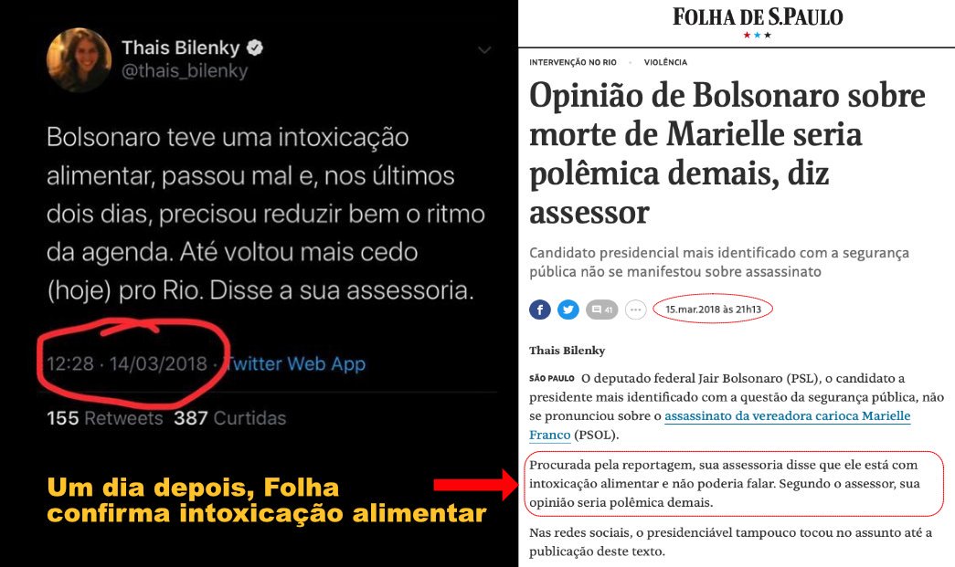 “Bolsonaro teve uma intoxicação alimentar, passou mal e, nos últimos dois dias, precisou reduzir bem o ritmo da agenda. Até voltou mais cedo (hoje) pro Rio. Disse a sua assessoria”, diz o texto, publicado às 12h28 do dia 14 de março de 2018.