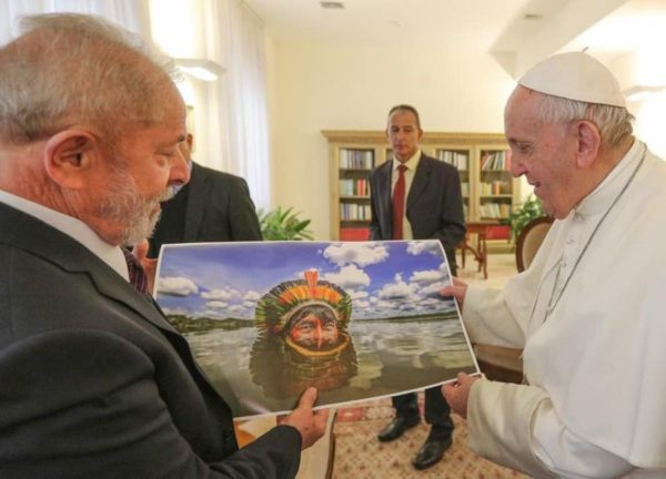 Durante o encontro no Vaticano ontem, Lula recebeu do Papa Francisco um rosário abençoado. E retribuiu o gesto presenteando o pontífice com uma imagem de Bejá Kayapó. A foto do indígena, registrada pelas lentes do fotógrafo oficial de Lula, Ricardo Stuckert (…) pic.twitter.com/NjmGz1wa43