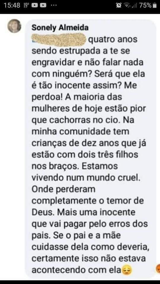 “Quatro anos sendo estuprada até engravidar e não falar nada com ninguém? Será que ela é tão inocente assim? Me perdoa! A maioria das mulheres de hoje estão pior que cachorras no cio. Na minha comunidade tem crianças de dez anos que já estão com dois filhos nos braços. Estamos vivendo num mundo cruel. Onde perderam completamente o temor de Deus. Mais uma inocente que vai pagar pelos erros dos pais. Se o pai e a mãe cuidasse dela como deveria, certamente isso não estava acontecendo com ela”, disse em comentário feito no Facebook.