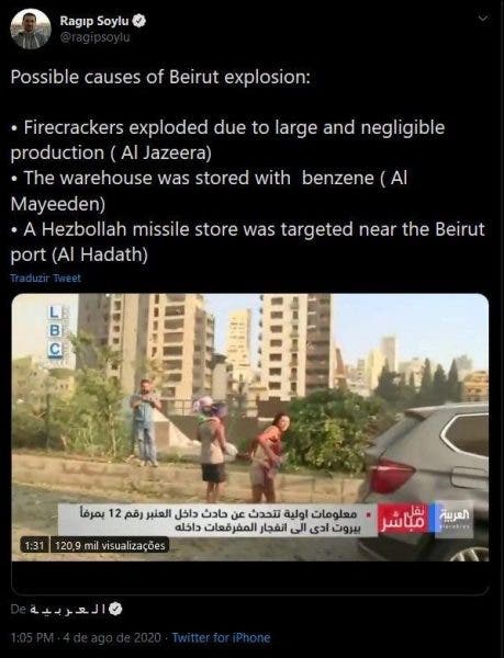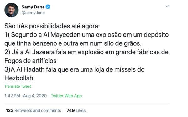 “São três possibilidades até agora: 1) Segundo a Al Mayeeden uma explosão em um depósito que tinha benzeno e outra em num silo de grãos. 2) Já a Al Jazeera fala em explosão em grande fábrica de Fogos de Artfício. 3) A Al Hadath fala que era uma loja de mísseis do Hezbollah”, escreveu Dana sobre a explosão.