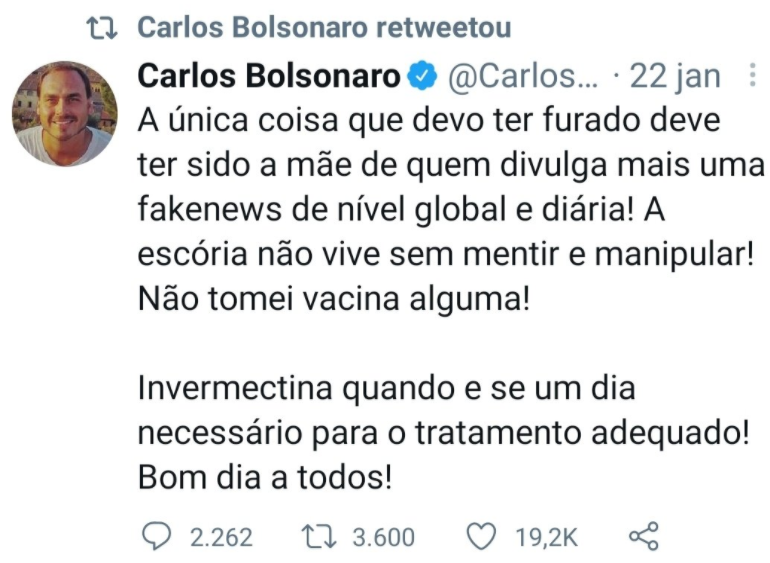 Nas redes sociais, Carlos Bolsonaro disse nesta quarta-feira (10) que seu pai nunca foi contra a vacina. Flávio Bolsonaro, por sua vez, pediu que os seus seguidores viralizam uma imagem do presidente com a seguinte legenda: ‘a melhor arma é a vacina’.