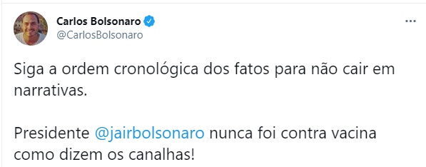 23h59: Carluxo diz que Bolsonaro nunca foi contra a vacina