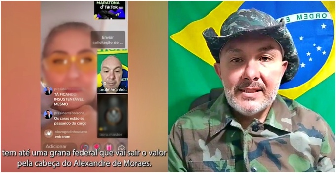 “Não vou falar agora quem é, mas existe: pode me torturar, mas tem um empresário grande aí que tá oferecendo…tem até uma grana federal que vai sair o valor pela cabeça do Alexandre de Moraes. Vivo ou morto, para quem trazer ele”, começa o influenciador, durante uma live ocorrida recentemente. A ameaça, então, passa a ser geral aos onze ministros do STF: “Demorou mas aconteceu: agora ministro do Supremo vai ter prêmio pela cabeça deles.”