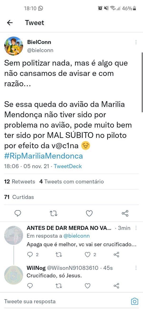 “Sem politizar nada, mas é algo que cansamos de avisar e com razão. Se essa queda do avião da Marília Mendonça não tiver sido por problema no avião, pode muito bem ter sido por um mal súbito no piloto por efeito da vacina”, publicou o internauta, cujo post ganhou bastante repercussão no meio bolsonarista.