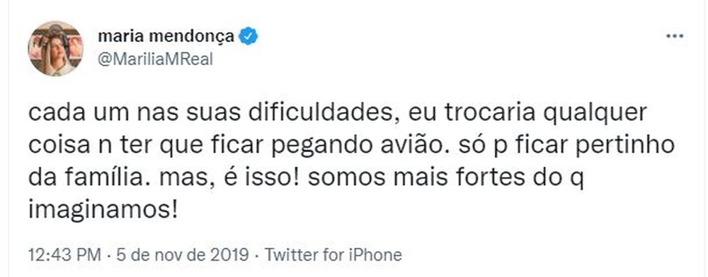 Em 5 de novembro de 2019, há exatamente dois anos, a cantora postou: “Cada um nas suas dificuldades, eu trocaria qualquer coisa para não ter que ficar pegando avião. Só para ficar pertinho da família. Mas é isso! Somos mais fortes do que imaginamos!”.