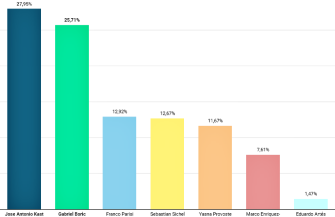 No levantamento da Activa Research, uma das mais conceituadas do país e divulgada em 6 de novembro, a vantagem de Kast sobre Boric era de quatro pontos percentuais (21,7% contra 17,7%), dentro da margem de erro de 3 pontos para mais ou para menos.