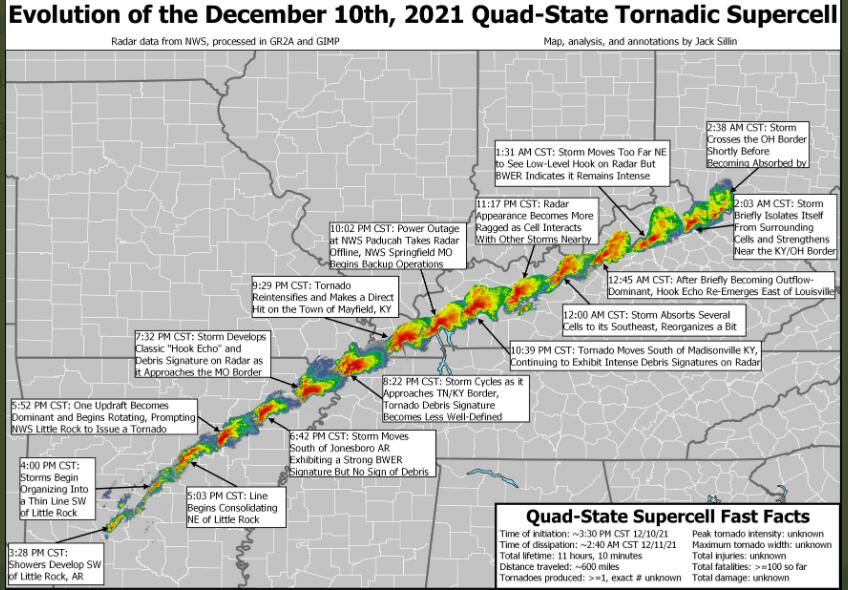 O Serviço Nacional de Meteorologia (National Weather Service) recebeu mais de 60 notificações de tornados em seis Estados na última sexta-feira: 14 em Arkansas, 13 em Missouri, 12 em Illinois, 11 em Tennessee, 14 em Kentucky, 2 em Mississípi, 1 no Alabama, 1 em Indiana e 1 Ohio. O mais devastador deles se deslocou por impressionantes 365 km, atravessando quatro Estados: Arkansas, Missouri, Tennessee e Kentucky.