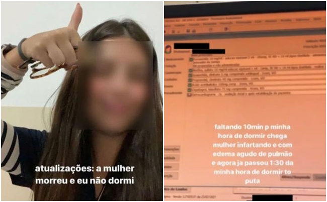 Em uma publicação nas redes, a futura médica reclamou: “Faltando 10 min para minha hora de dormir, chega mulher infartando e com edema agudo de pulmão, e agora já passou 1:30 da minha hora de dormir, tô puta”. Instantes depois, a estudante fez uma selfie sorrindo, com um sinal de legal e escreveu: “Atualizações: a mulher morreu e eu não dormi”.