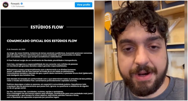 “Ao longo da nossa história, tratamos de temas sensíveis buscando promover conversas abertas sobre assuntos relevantes para a nossa sociedade, sem preconceitos ou ideias preconcebidas, pelo que acreditamos e defendemos. Reforçamos nosso comprometimento com a Democracia e Direitos Humanos, portanto, o episódio 545 foi retirado do ar. Comunicamos também a decisão que a partir de agora, o youtuber Bruno Aiub, o Monark, está desligado do Estúdios Flow”, comunicou.