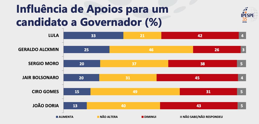 Além disso, em simulações de segundo turno, Lula também vence todos seus adversários no estado. Contra Bolsonaro, a vitória seria por 46% a 34%. Se enfrentasse Moro, ganharia com 46% a 33%. Caso o governador João Doria (PSDB) passasse do primeiro turno, o petista teria a preferência de 47% dos eleitores, ante 26% do tucano.