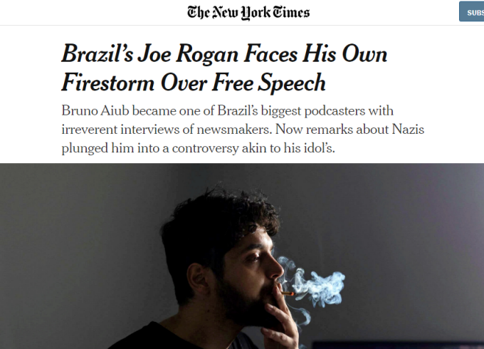 Na matéria, o NYT afirma que Monark modelou o podcast “Flow” com base no projeto de Rogan e, atualmente se vê em situação semelhante a de seu ídolo.