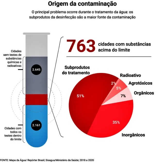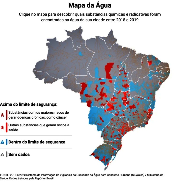 As informações podem ser consultadas por cidade no Mapa da Água, que destaca quais substâncias extrapolaram o limite e explica seus riscos. Os dados são resultados de testes feitos por empresas ou órgãos de abastecimento e enviados ao Sisagua (Sistema de Informação de Vigilância da Qualidade da Água para Consumo Humano), do Ministério da Saúde. Os testes são feitos após o tratamento e a maioria dessas substâncias não pode ser removida por filtros ou fervendo a água.