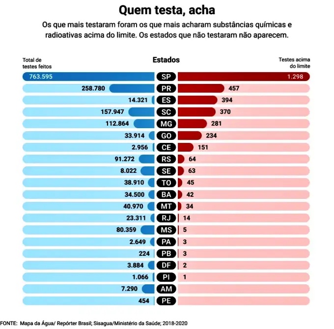 Quase todos os estados que testaram a água acharam problemas. São Paulo foi o que mais encontrou, com 1.298 resultados acima do limite, mas também foi o que mais testou. Foram 831 mil testes, 45% de todos os realizados no país.