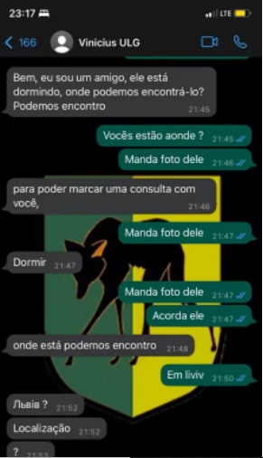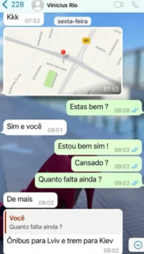 À noite, Vinícius trocou mensagens com um outro brasileiro que se identifica como aliado das tropas ucranianas na guerra enquanto planejava seguir em direção à fronteira com o país vizinho.