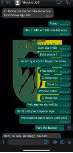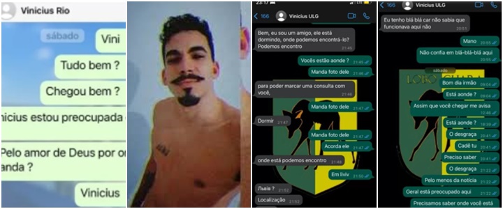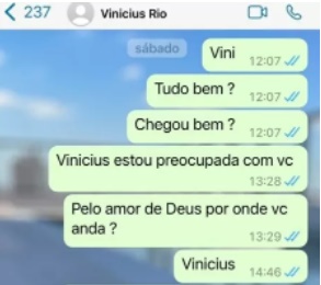 “Vinicius, estou preocupada com você”, escreveu a amiga. “Pelo menos dá notícia. Geral preocupado. Precisamos saber onde você está para lhe buscar”, registrou o outro brasileiro.