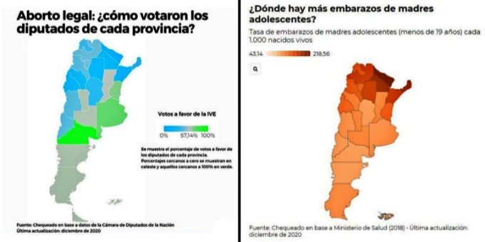 É relevante observarmos o mapa de como votaram deputados de cada província comparando-o ao mapa dos índices de gravidez na adolescência: regiões com números mais alarmantes de gravidez juvenil foram aquelas cujos deputados e deputadas votaram majoritariamente contra a possibilidade de interrupção. De início, precisamos recordar que muito pouco foi feito desde 2018, quando o senado argentino foi contrário ao aborto legal; a educação sexual não foi ampliada e melhorada nas escolas. Com essa recordação em mente, precisamos comparar esses dois mapas ao que se refere a pobreza crônica na Argentina: províncias com maior incidência de pobreza também possuem altos índices de gravidez na adolescência. Qual o motivo de tantos deputados dessas mesmas regiões serem majoritariamente contrários à nova lei?
