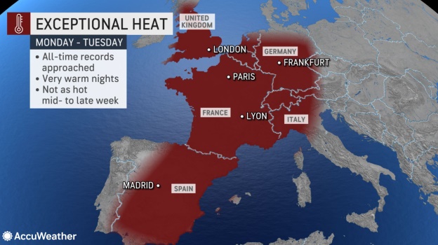 Na França, também foi emitido um alerta de calor extremo. O norte da Espanha registrou temperaturas de 43°C na segunda-feira. Incêndios florestais provocaram mortes na França, Portugal, Espanha e Grécia, e forçaram milhares de pessoas a deixar suas casas.