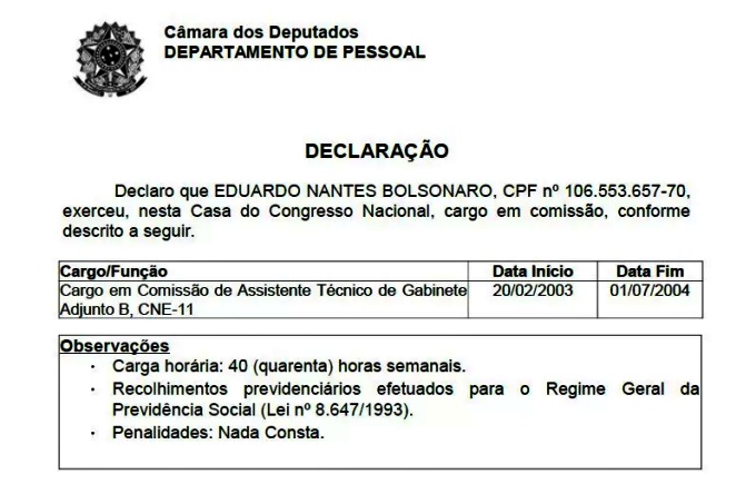 A BBC encontrou a comprovação de contratação de Eduardo Bolsonaro em pesquisa no site da Câmara dos Deputados. Já o currículo público do próprio deputado federal, também no site da Casa, não faz nenhuma referência ao posto no PTB na seção “Atividades Profissionais e Cargos Públicos”.