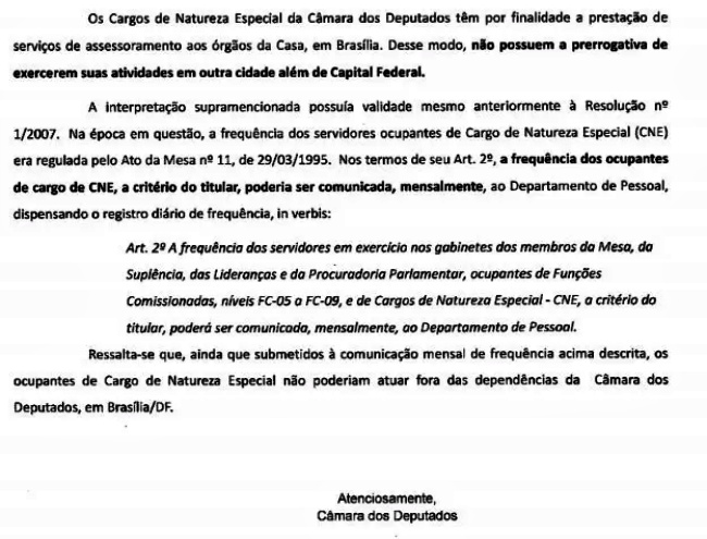 Mas, segundo as normas da Câmara dos Deputados vigentes à época, o posto foi ocupado de forma irregular. Só poderia ter sido preenchido por alguém que desse expediente no Congresso, já que esse tipo de cargo tem “por finalidade a prestação de serviços de assessoramento aos órgãos da Casa, em Brasília. Desse modo, (os servidores) não possuem a prerrogativa de exercerem suas atividades em outra cidade além da capital federal”.