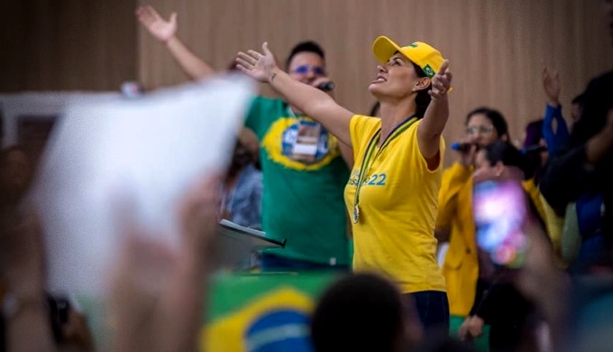 “Saiam daqui com uma chama acesa no coração para multiplicar os votos dos que ainda estão indecisos. Peçam sabedoria para conversar com eles. Precisamos tirar esse espírito do mal do Brasil. Estamos trabalhando para o nosso povo ter liberdade religiosa”, diz Michelle Bolsonaro, primeira-dama.