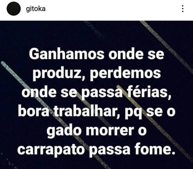 “Ganhamos onde produz, perdemos onde se passa férias. Bora trabalhar porque se o gado morre, o carrapato passa fome”, publicou em sua conta no Instagram.