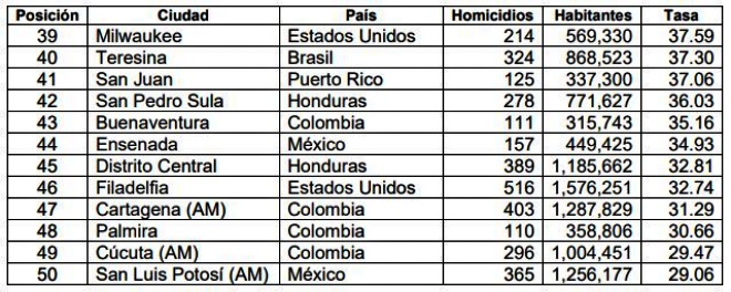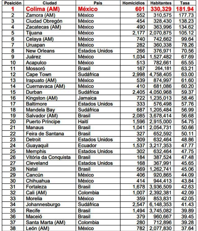 O México tem a cidade mais violenta do mundo segundo o levantamento. Colima tem uma taxa de 181,94 homicídios para cada 100 mil habitantes. O país ainda registrou 17 cidades na lista, sendo que as sete primeiras posições são ocupadas por cidades mexicanas.