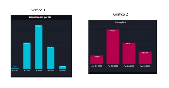 Ela monitorou uma série de perfis relevantes de atores políticos e de veículos de informação no YouTube, no Instagram e no Facebook e verificou que em 22 e 23 de abril tais contas não fizeram nenhuma menção ao PL 2630/2020. No dia 24, foram 6.652 visualizações de vídeos e posts relacionados com o assunto. Nos dias seguintes, o tema simplesmente explodiu nas redes, como você pode ver nos dois gráficos abaixo, que mostram a evolução das visualizações e das interações (comentários, curtidas e compartilhamentos).