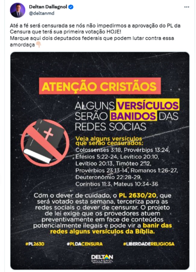 Coube ao deputado Deltan Dallagnol (Podemos-PR) criar a mais comentada fake news, atribuindo ao PL uma suposta censura a trechos da Bíblia. Apesar de a crítica ser inteiramente falsa, foi incorporada ao discurso de parte da bancada evangélica e levou Orlando Silva a incluir uma alteração no texto para evidenciar que seu texto assegura pleno respeito a crenças religiosas. Veja o post de Deltan no Twitter: