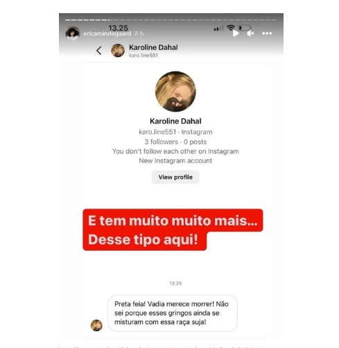 Nas mensagens privadas, uma usuária chamou Erica de “preta feia” e afirmou que não sabe “por que os gringos ainda se misturam com essa ‘raça suja'”.