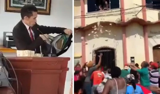 O vereador pega as notas na mochila e arremessa uma quantia pela janela. Uma multidão se aglomerou na frente da Câmara para pegar o dinheiro.