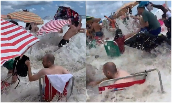 Mais um vídeo do momento onde onda gigante atinge praia do Rio de Janeiro 😳🌊 pic.twitter.com/erwyyr64OZ