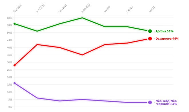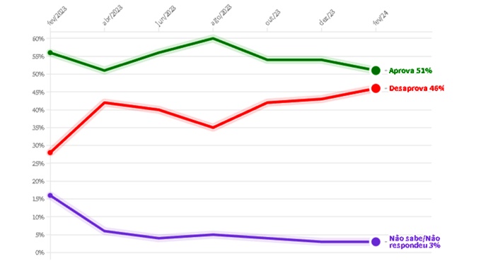 ⭢ Em fevereiro, 46% desaprovam o trabalho de Lula; eram 43% em dezembro.