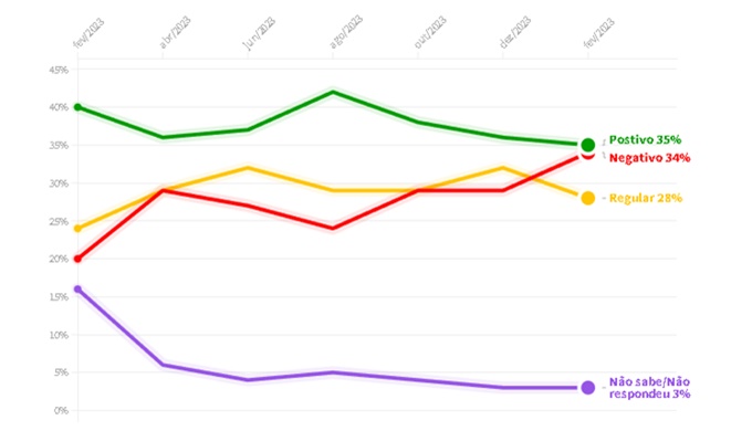 O governo do presidente Luiz Inácio Lula da Silva (PT) é avaliado como negativo por 34% dos entrevistados.