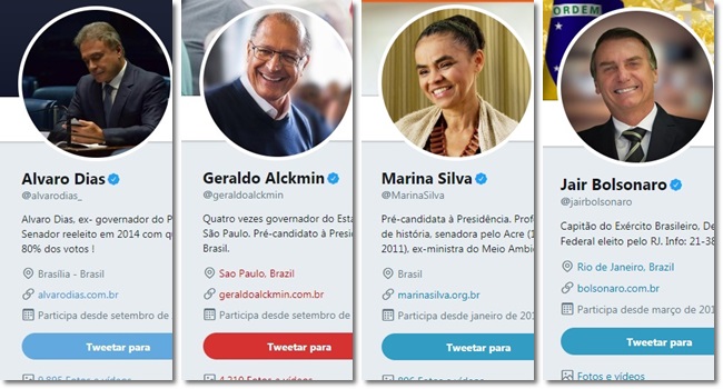 Estudo realizado pelo Instituto InternetLab aponta que dentre os seguidores do pré-candidato Alvaro Dias (Podemos) no Twitter, em torno de 64% são perfis falsos, também conhecidos como bots ou robôs. Atrás de Dias, os pré-candidatos com o maior índice de perfis falsos entre os seguidores são Geraldo Alckmin (PSDB), com 46%, Marina Silva (Rede), com 36%. Pelo menos um em cada três (34%) perfis que formam a audiência de Jair Bolsonaro (PSL) também é um robô.
