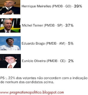 Henrique Meirelles venceu por uma pequena margem entre os internautas leitores de pragmatismo político, mas decidiu, na semana da realização desta enquete, que permanecerá no Banco Central até o fim do mandato do presidente Lula. O presidente da legenda (PMDB), Michel Temer, é o provável indicado.
