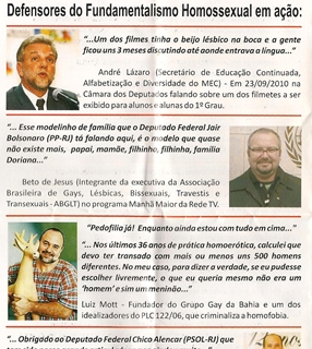 Em uma das partes do panfleto, “Defensores do fundamentalismo homossexual em ação”, aparecem fotos e frases do presidente do Grupo Gay da Bahia, Luiz Mott, do presidente da Associação Brasileira de Lésbicas, Gays, Bissexuais, Travestis e Transexuais (ABGLT), Toni Reis e de Beto de Jesus, integrante da executiva da entidade. O secretário de Educação Continuada, Alfabetização e Diversidade do Ministério da Educação (MEC), André Lázaro também é mencionado em razão de um comentário dele sobre um dos vídeos que fazem parte do kit de combate à homofobia – apelidado pelos críticos de “kit gay” -, que será distribuído em escolas públicas.