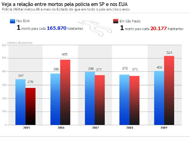 Com uma população quase oito vezes menor que a dos Estados Unidos, o Estado de São Paulo registrou 6,3% mais mortes cometidas por policiais militares do que todo os EUA em cinco anos, levando em conta todas as forças policiais daquele país. Dados divulgados pela SSP (Secretaria de Segurança Pública), e analisados pela Ouvidoria da Polícia, revelam que 2.045 pessoas foram mortas no Estado de São Paulo pela Polícia Militar em confronto – casos que foram registrados como resistência seguida de morte – entre 2005 e 2009.