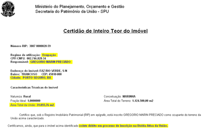 Ele conseguiu ocupar um terreno da Marinha em Porto Seguro (BA), na valorizada localidade de Trancoso, no litoral sul baiano, de 31 mil metros quadrados. A área equivalentes a 155 terrenos de 200 metros quadrados, um tamanho razoável para uma casa de classe média sem luxo. Ou ainda, pra usar uma comparação ao gosto do brasileiro, o lote tem a medida de três campos oficiais de futebol – nada mau para uma casinha na praia.