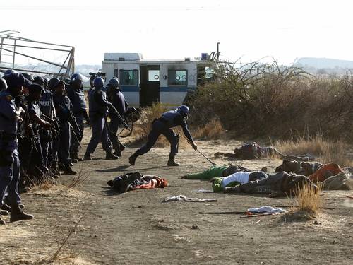 A chacina de quinta-feira 16 ocorreu nas minas de Marikana (a 40 quilômetros de Johannesburgo), onde a empresa britânica Lonmin obtém 96% da platina que exporta para todo o mundo. As cenas jogaram os sul-africanos mais de uma década para trás. Em trajes de choque e fortemente armados, os policiais montavam barricadas com arame farpado quando foram flanqueados por grupos de trabalhadores, muitos deles armados com machetes, lanças e outras armas improvisadas. A polícia, então, abriu fogo contra os manifestantes. Após a salva de tiros, pelo menos sete corpos ficaram no chão. A agência Reuters afirmou que até 18 pessoas podem ter sido assassinadas.