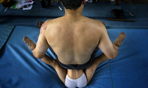 Menina chora enquanto o treinador pisa em suas pernas para estirar os ligamentos. Foto: Global Times