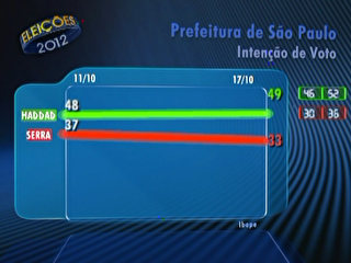 O candidato do PT à Prefeitura de São Paulo, Fernando Haddad, oscilou um ponto porcentual para cima, de 48% para 49%, na segunda pesquisa Ibope/TV Globo divulgada no segundo turno. Já o tucano José Serra caiu quatro pontos em uma semana, de 37% para 33%. Com isso, a distância entre os dois aumentou de 11 para 16 pontos.